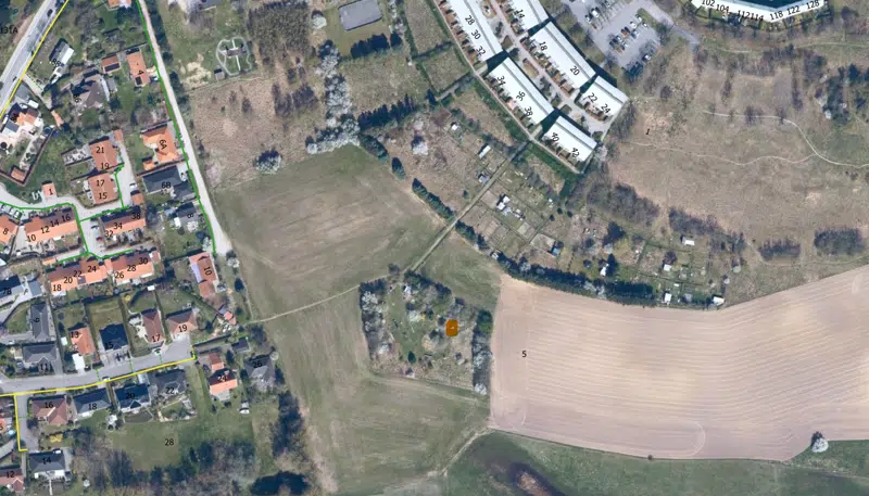 Herunder kan du se placeringen af prøveboringen, det er den orange cirkel, midt i hundelegepladsen.