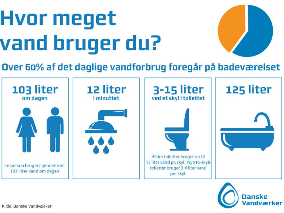 Vandforbruget for din familie afhænger af dine forbrugsvaner og installationer, og kan være vidt forskellig for to husstande med det samme antal personer. Nogle tager lange bade og vasker bil, mens andre har installeret vandsparer og udnytter regnvandet til havevanding.
