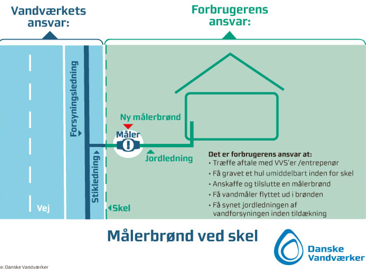 Halsnæs Vandforsyning leverer dit drikkevand gennem et net af vandledninger. Fra de gennemgående vandledninger ude i vejen går der ledninger ind til den enkelte ejendom. Halsnæs Vandforsyning ejer den del af ledningen - kaldet stikledning - der går fra hovedledningen i vejen og hen til skel. Fra skel og ind til din ejendom kaldes ledningen en jordledning - den skal du som grundejer selv vedligeholde og den er din ejendom.